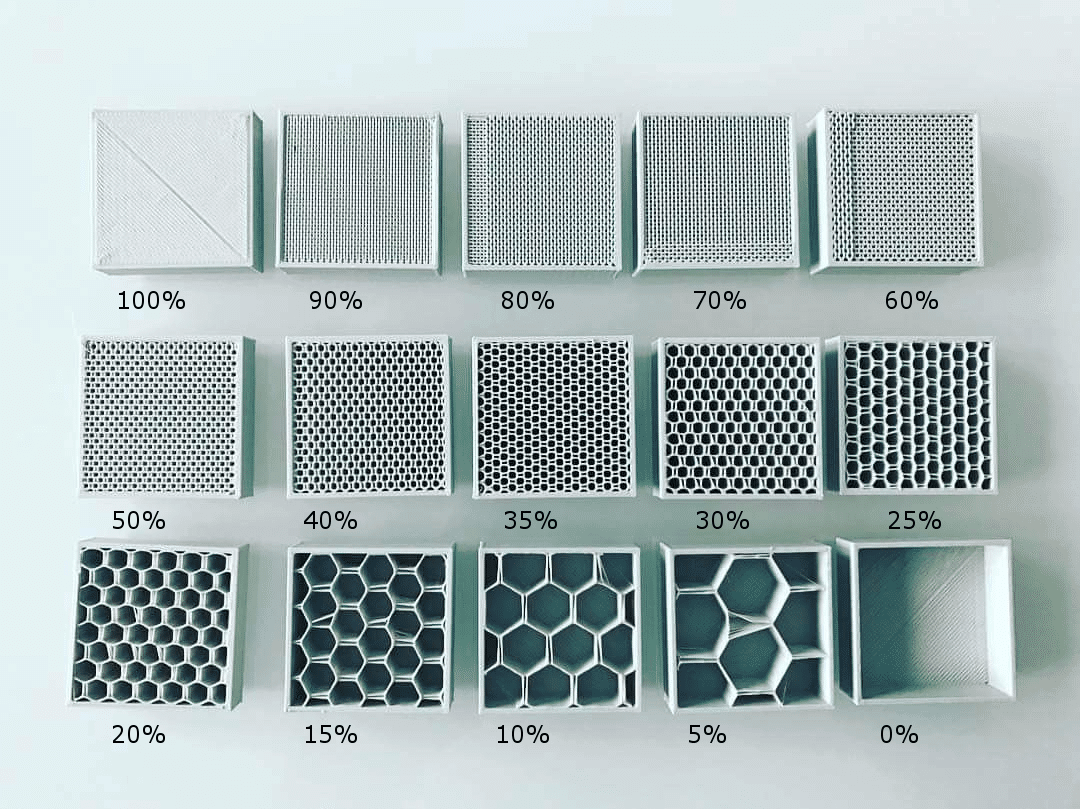 Măsurat în procente, 0% este partea 3D goală din interior și 100% este partea complet umplută cu material. Bineînțeles, există multe nivele între ele și potrivirea acestei valori este importantă din mai multe perspective. O caracteristică foarte importantă definită de nivelul de umplere este greutatea imprimării 3D. Nivelul ridicat de densitate înseamnă imprimări puternice, dure și foarte durabile. În schimb, un nivel scăzut va oferi părți flexibile, mai ușoare, dar mai fragile.