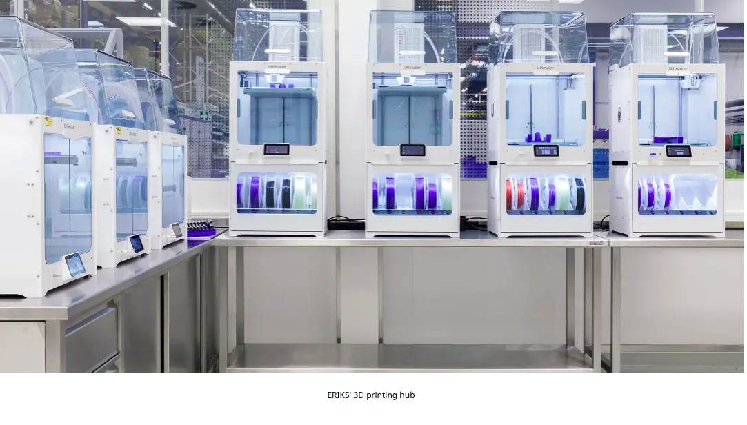 După o scanare a site-ului, piesele sunt proiectate fie de clienți înșiși, fie de ingineri ERIKS, apoi sunt tipărite utilizând imprimante Ultimaker S5 la instalația Alkmaar. Aceste camere acționează ca zone controlate de mediu în care procesul de tipărire poate fi atent monitorizat, rezultând piese „certificate” - garantând nu numai calitatea și eficacitatea, ci și reproductibilitatea și fiabilitatea.