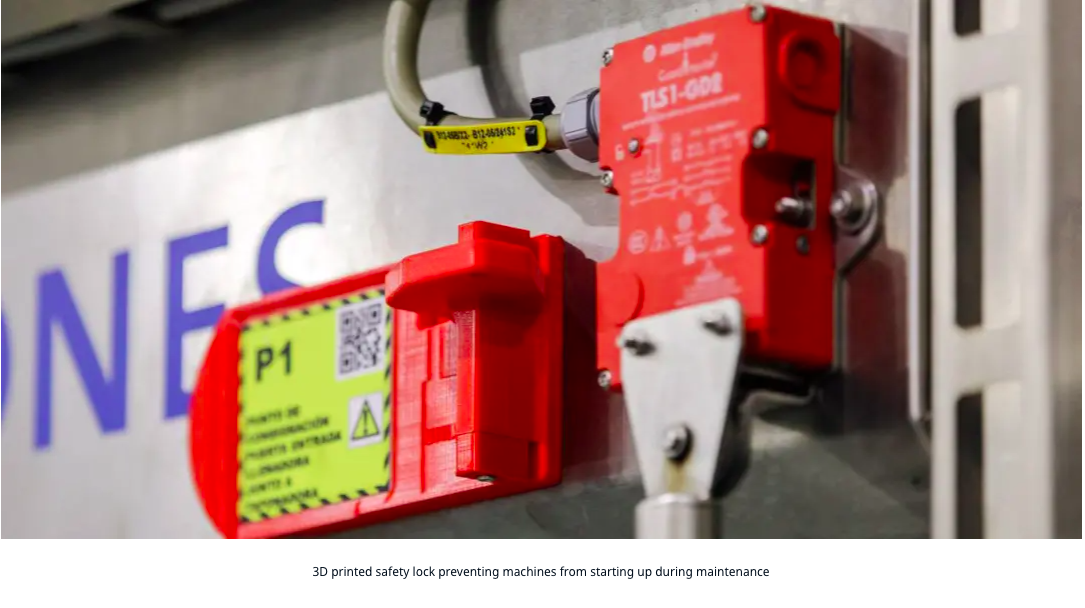 Zăvoarele sunt imprimate în roșu aprins pentru a le asigura vizibilitatea. Această aplicație a fost nu numai utilă, dar caracteristica suplimentară de siguranță a creat conștientizarea și aprecierea imprimării 3D în rândul angajaților.