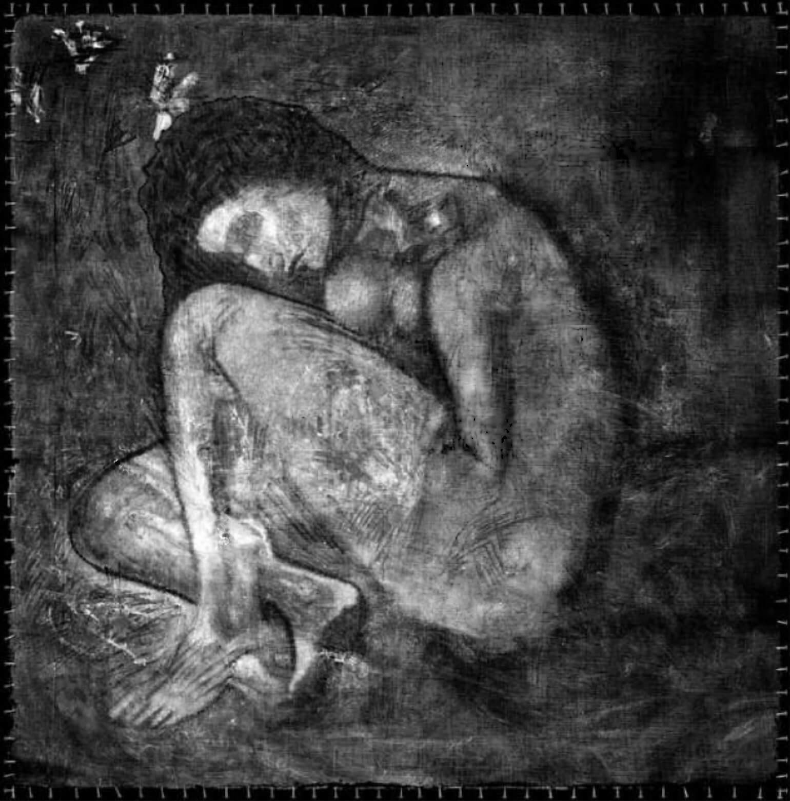 Existența picturii ascunse sub Micul-dejun al orbului a fost descoperită prin utilizarea imaginilor cu fluorescență cu raze X (XRF) în 2010. Această imagine ascunsă a devenit cunoscută sub numele de Nudul singuratic ghemuit și puteți vedea cum arată mai jos. Cercetătorii au scanat mai întâi Micul-dejun al orbului cu raze X și imagini în infraroșu pentru a determina formă și caracteristicile picturii ascunse. Apoi, o rețea neuronală artificială a fost programătă pentru a reproduce caracteristicile lucrării lui Picasso, precum ar fi mișcările pensulei.