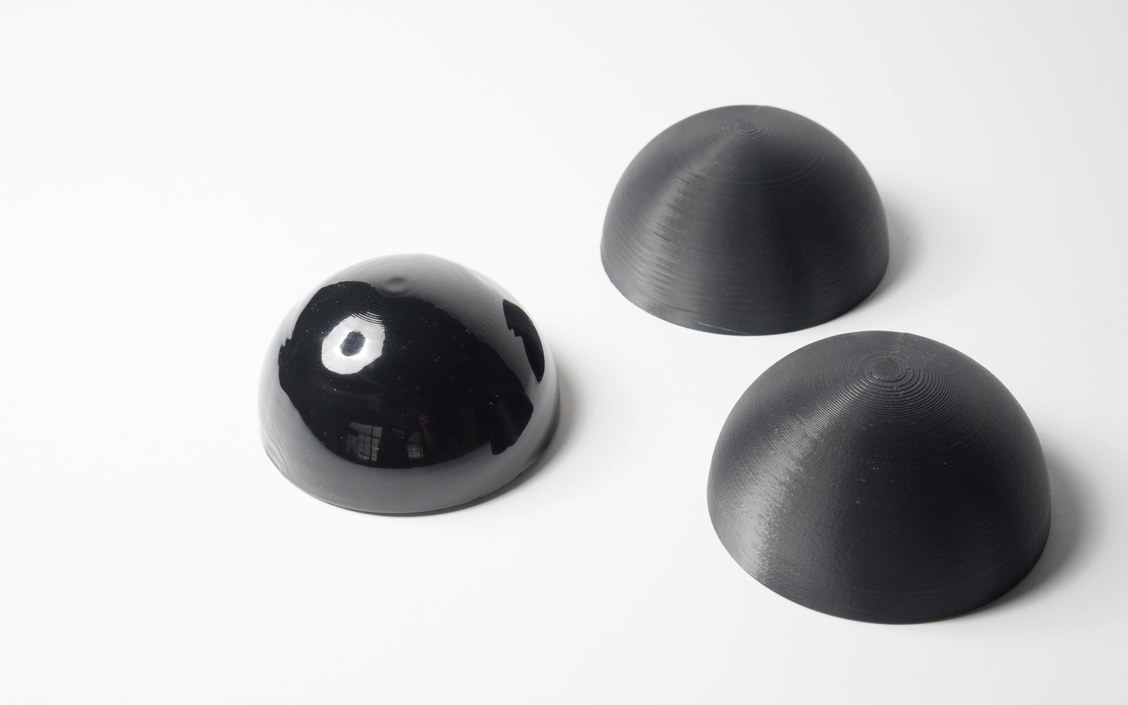 Un imprimeu ABS de 100 microni tratat cu acetonă (stânga), un imprimeu ABS de 100 microni (mijloc) și un imprimeu ABS de 200 microni (dreapta).