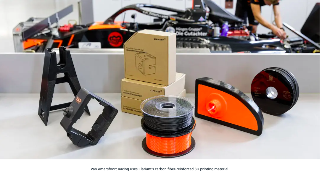 Clariant a furnizat, de asemenea, echipei un filament PET-G personalizat, folosit pentru „pernele interioare” ale instrumentului de aliniere din spate, prevenind zgârierea vopselei la instalarea instrumentului. PET-G are culoarea fluorescentă-portocalie exact ca decalcomaniile de pe mașina Van Amersfoort Racing Formula 3, oferind un aspect elegant, profesional, în conformitate cu estetica echipei.